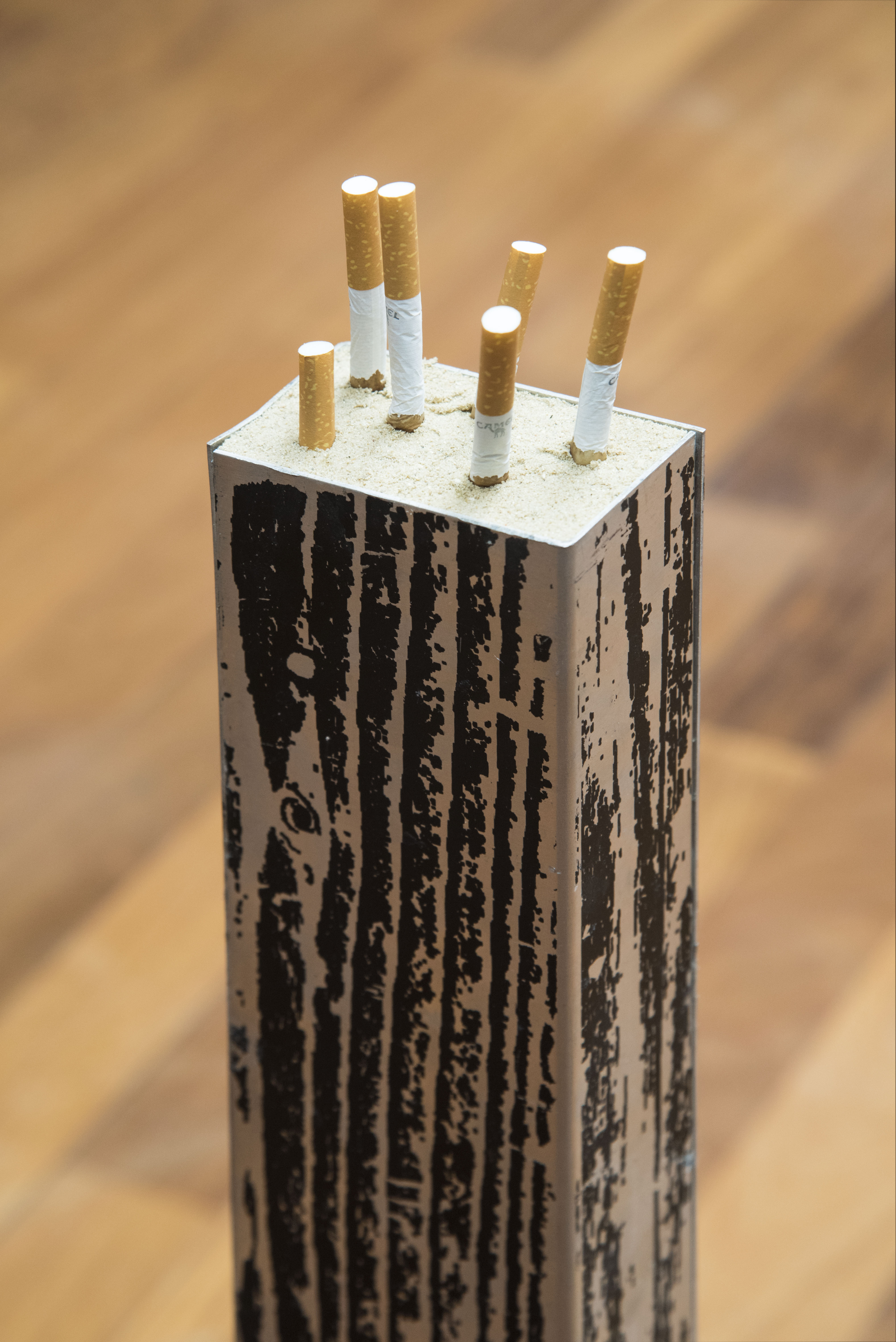 Silkscreened aluminium, sand, cigarettes,85x7cm, 2016